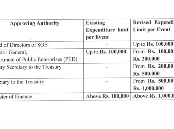 The new directive subject to some strict conditions will allow a member of a SOE board of director to spend Rs. 100,000 per event, while it allows a director general of a Department of Public Enterprise to spend between Rs. 100,000 – 200,000 per event, the circular signed by Treasury Secretary Harshana Suriyapperuma showed.