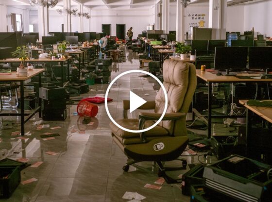 Holy moly. Look at these phones. The floor is just littered with SIM cards. We’re in Myanmar. Only weeks after rebel fighters took control of a cyberscam center near the border with Thailand. For years, Chinese criminals have used ordinary office spaces like this in the middle of the jungle to target Americans in elaborate online fraud. OK, here we are, the nerve center of this multibillion-dollar industry that is scamming people all across the world. More than 3,000 people from dozens of countries were once employed here, joining an industry that has proliferated during Myanmar’s civil war. There’s just row after row of monitors. Looks just like a normal office park. This is all evidence of scamming. Many of the workers fled, leaving behind documents and records detailing the scams. This looks like a receipt. There were also piles of electronic equipment, the main tools of their trade. Here are AT&T SIM cards. So you can just pretend that you’re calling from the United States. The scammers would act like potential love interests and send messages to their targets on social media. They would target lonely hearts in the United States and pretend to be beautiful, young Asian women who were interested in just making a connection with somebody. As their relationships with their victims grew closer, the scammers would then move the conversation to a video call. This is a video call room, and you can see that they’ve got a fake background and they’ve got fake flowers, some books. This looks like a book, but it’s actually just a box. When victims would send in large amounts of money, the scammers would celebrate. When you make $5,000 bucks, you hit the gong, and then when you make $50,000 bucks, you hit this very large drum. And in between is the god of wealth. [explosion] Jesus Christ, it’s close. Our visit was punctuated by the thud of mortar rounds that forced us to seek cover. “Hurry, hurry.” But many of the Chinese workers still living in the complex seemed unfazed about being in the middle of a war zone. We tried to speak to some of them during our visit to the compound. These are the scammers who are not willing to leave. Some said they were lured by fake job offers and forced to work in the scam industry. If they go home to China, they said, they’ll likely be arrested. So for now, their best hope is to find another job here in war-torn Myanmar.