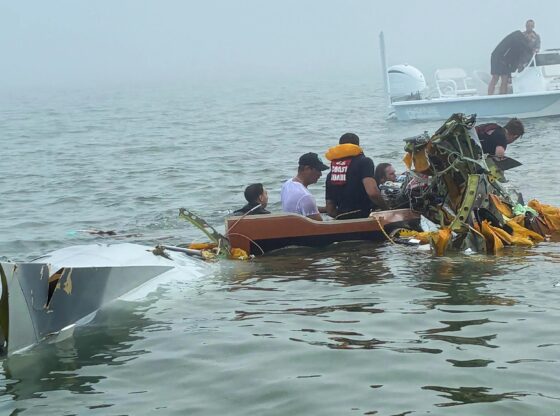 Footage shows the plane wreck laying in the water, with witnesses and police officers searching the debris.
